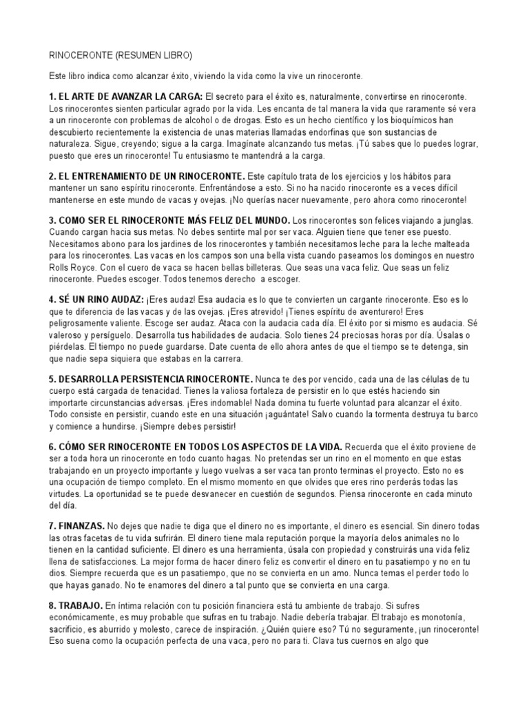 El libro rinoceronte resumen es uno de los libros de ccc revisados aquí libro el rinoceronte. Resumen del libro el rinoceronte este resumen es del libro el rinoceronte cuenta con 15 capitulos que basicamente se trata de una guia practica para alcanzar el éxito.el personaje principal es el rinoceronte y habla básicamente de que somos nosotros los rinocerontes.