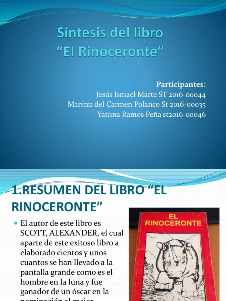 Libro El Rinoceronte Resumen / Pdf Resumen Y Opinion De El Libro El Rinoceronte S Alexander Angel Huamani Vega Academia Edu - El teatro de ionesco es la realización de un anhelo colectivo basado en el savoir faire de su ruptura lógica, en la huida inexorable de los elementos naturales visibles, que están en la base misma de su comicidad.. Mi opinión sobre el rinoceronte.por favor léelo o escúchalo te va a cambiar tu vidatoma acción!! Por scott alexander síntesis y comentarios por jesús gómez espejel. El arte de avanzar avanzar la carga: El teatro lonesco es la realización de un anhelo colectivo basado en el savoir faire de su ruptura lógica, en la huida inexorable de los elementos naturales visibles que están en la base de su comicidad. Los rinocerontes son felices viajando a junglas.