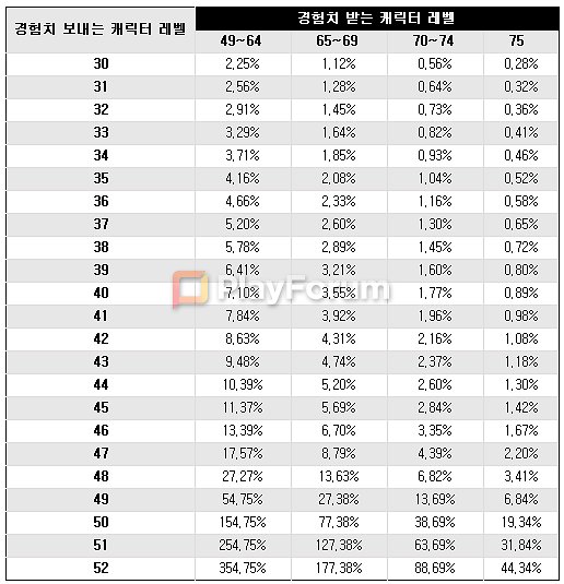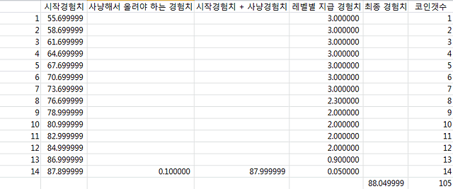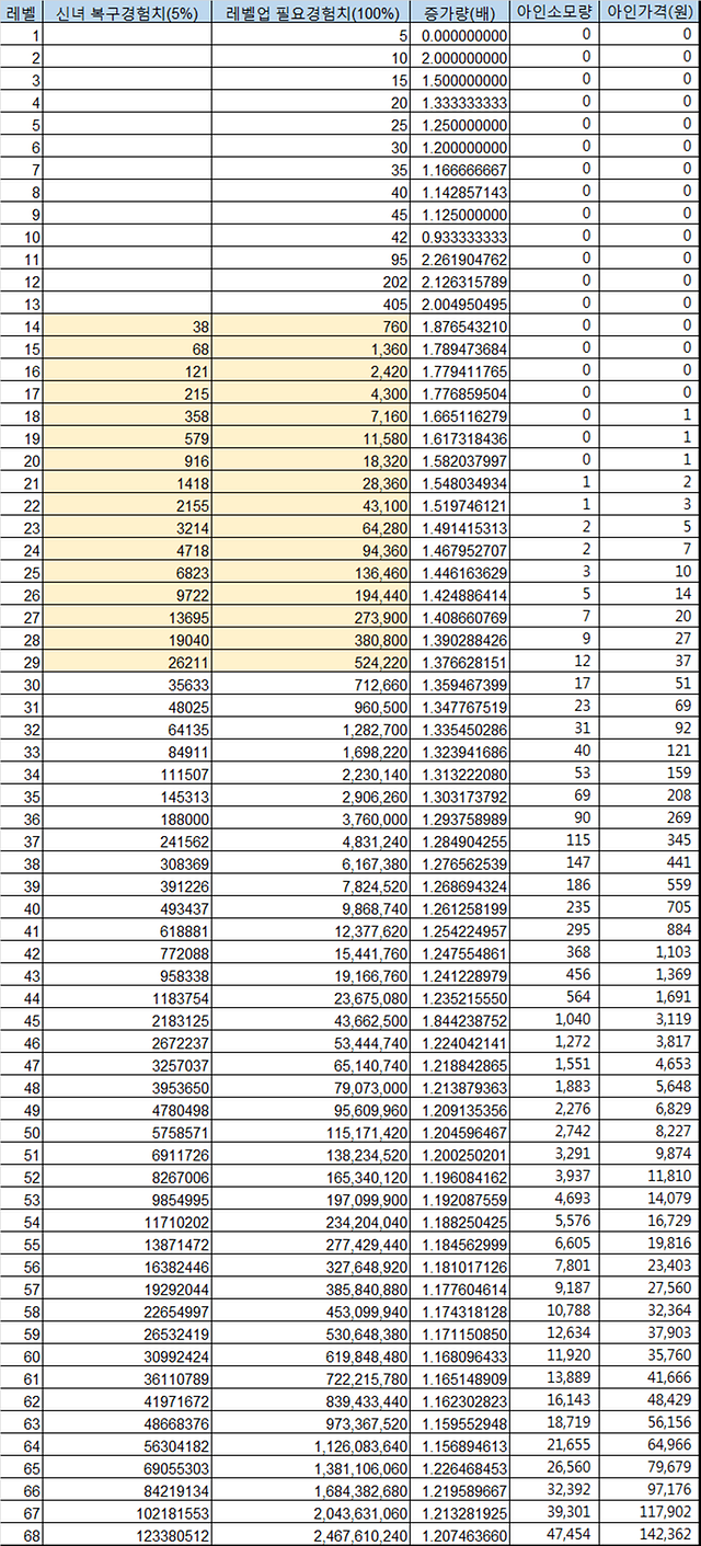 간시라는 아이디를 사용하는 인벤 유저가 공개한 경험치표는 1레벨부터 68레벨까지 신녀 복구경험치, 레벨업 필요경험치, 증가량(배), 아인소모량, 아인가격을 쉽게 확인할 수 있다.