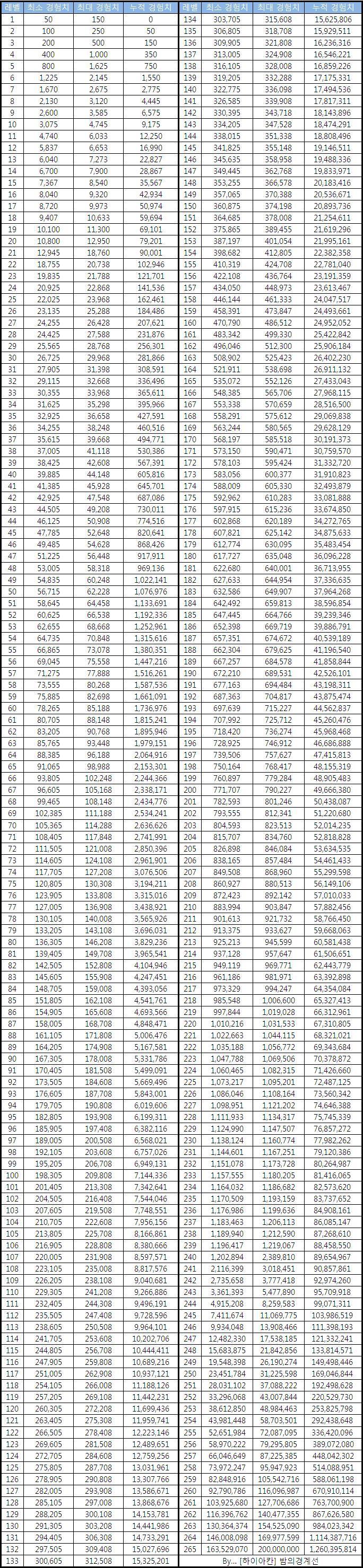 철저하게 신녀 복구 경험치 (5%)로 확인한 데이터 입니다 리니지m. 2013년 1월 31일 언리미티드 후속 패치 로 최고 레벨이 200에서 250레벨로 확장되었다.