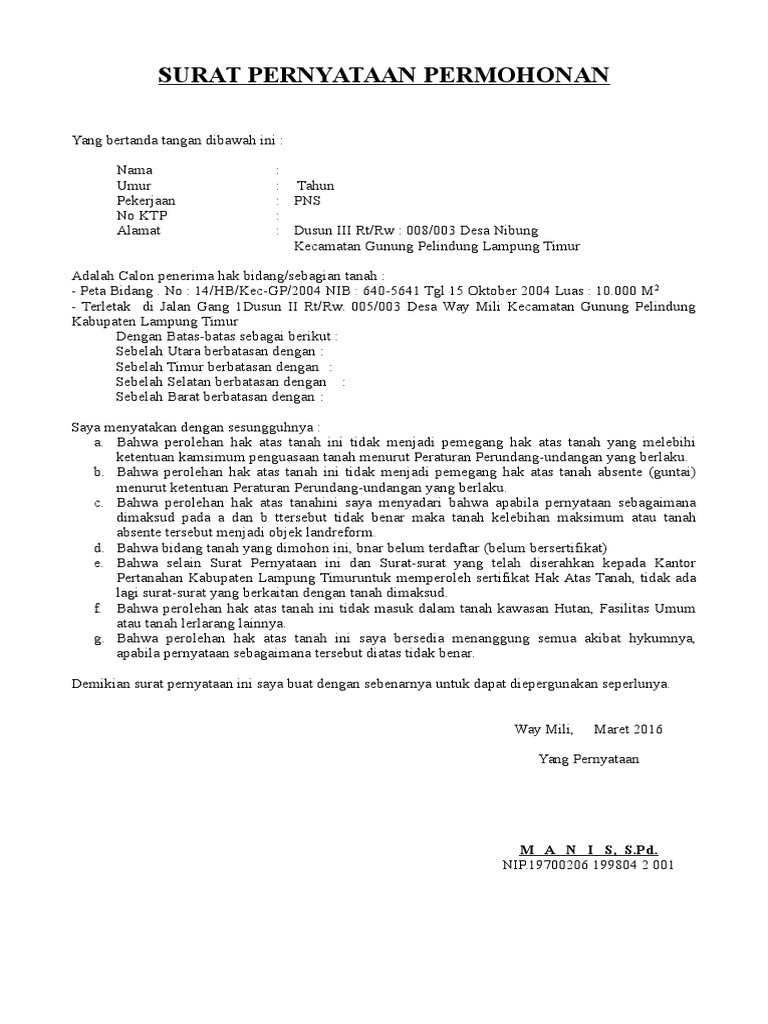 Identitas tersebut akan dibuktikan dengan fotokopi kartu identitas diri. Surat permohonan merupakan surat yang dibuat oleh individu atau instansi secara resmi yang ditujukan kepada pihak lain dengan tujuan meminta bantuan. Khusus untuk pembelian tanah dan/atau bangunan dilokasi sudut (hock) atau dengan bentuk ireguler, maka apabila tanah dan/atau bangunan yang ketentuan ganti nama 1. Proses pembelian dan penjualannya pun tidak cara mengajukan permohonan hak milik atas tanah negara. Surat permohonan hendaknya mempunyai kop surat yang mencantumkan nama organisasi atau instansi terkait yang mengajukan permohonan.