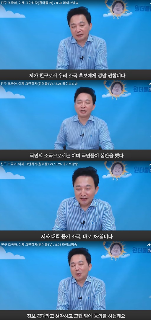 원희룡 제주지사 개인 유튜브 방송 '원더풀tv' 캡처. 조국 억울하다조국 찌질하다…우상호·원희룡 '386 썰전' 중앙일보 입력 2019.09.28 01:40 수정 2019.09.28 14:34 카카오톡 페이스북 트위터 카카오스토리 조국 일가 사건 계기로 '어긋난 부모찬스'는 대한민국서 사라지게 하겠다 원희룡 전 제주도지사 페이스북. 원 지사는 2일 페이스북에 조 전 장관이 쓴 회고록 제목을 비튼. 두 사람 서울대 법대 82학번 동기죠.